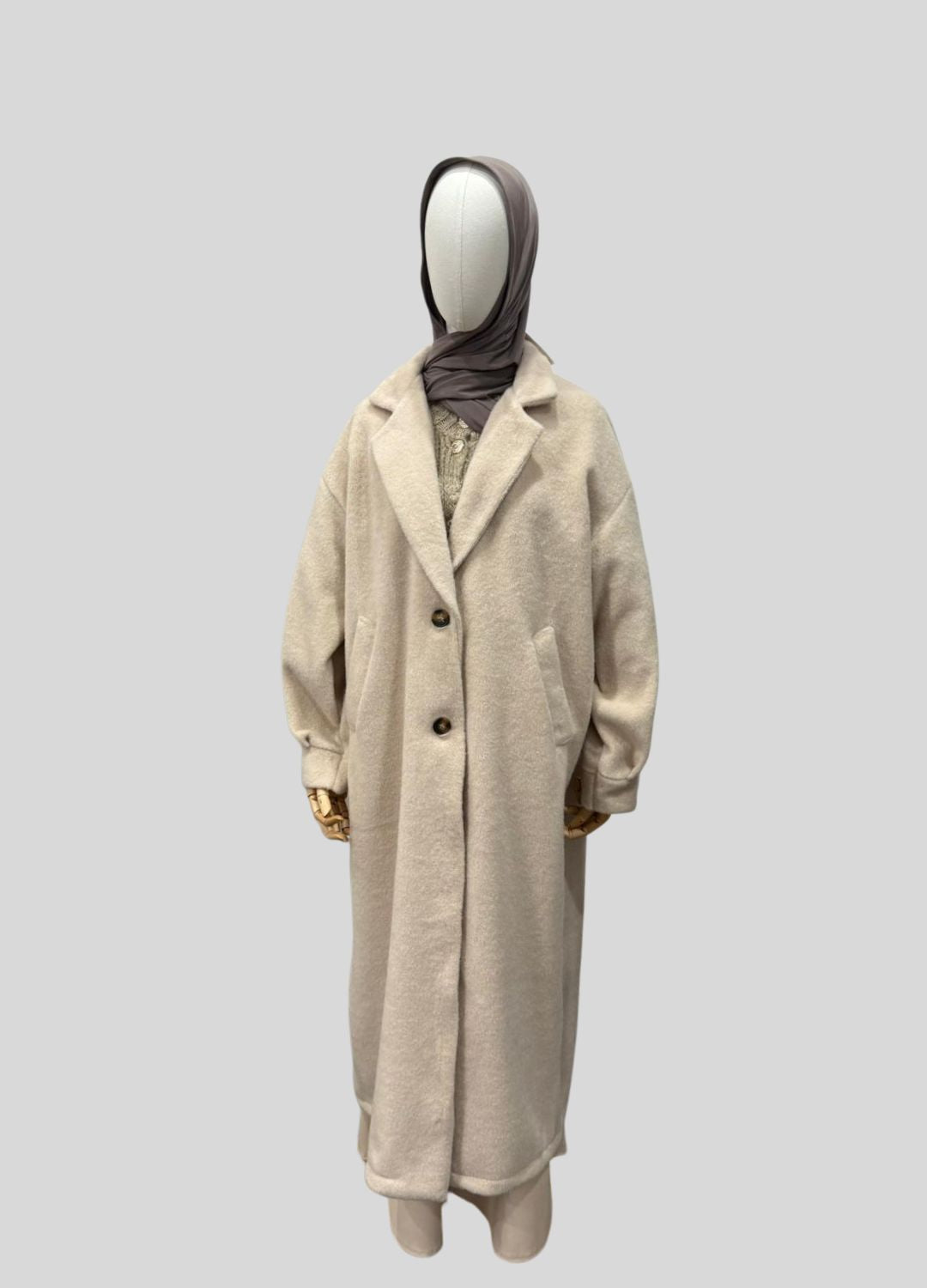 Der Mantel überzeugt durch seine schlichte Eleganz und den modernen Oversize-Look.