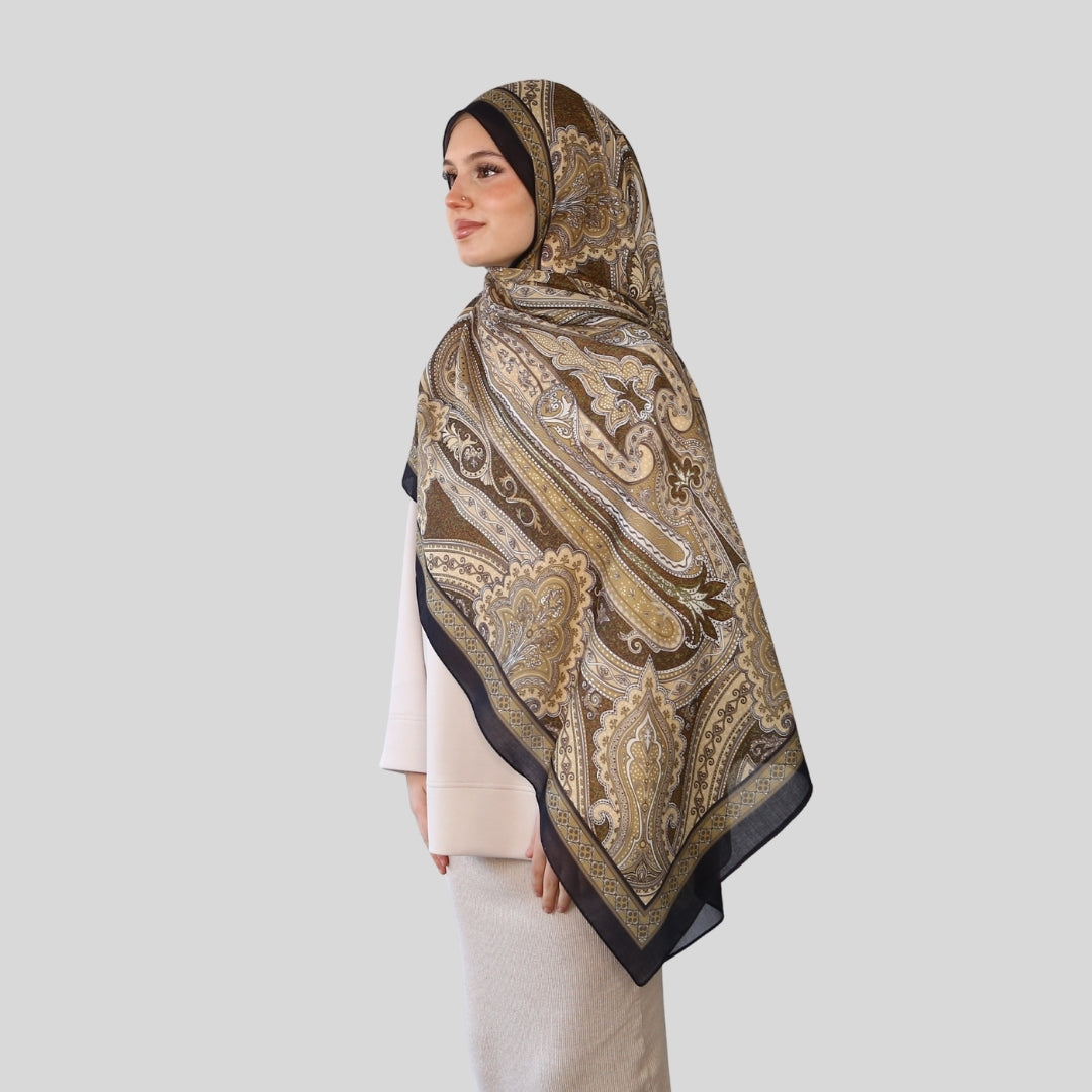 Dieser Hijab besteht aus weichem, atmungsaktivem Stoff und bietet ein angenehmes Tragegefühl. Er ist blickdicht, leicht formbar und für verschiedene Anlässe geeignet. Das Tuch zeichnet sich durch ein hochwertiges orientalisches Muster aus, das dem Design eine edle Note verleiht.