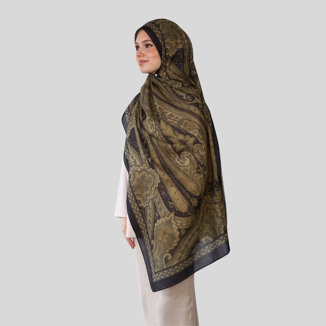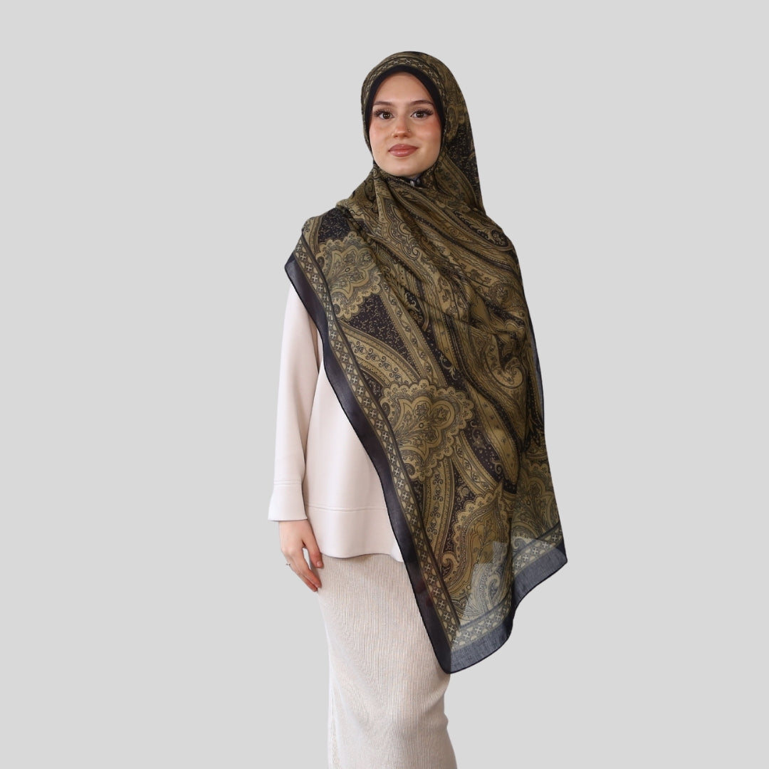 Dieser Hijab besteht aus weichem, atmungsaktivem Stoff und bietet ein angenehmes Tragegefühl. Er ist blickdicht, leicht formbar und für verschiedene Anlässe geeignet. Das Tuch zeichnet sich durch ein hochwertiges orientalisches Muster aus, das dem Design eine edle Note verleiht.