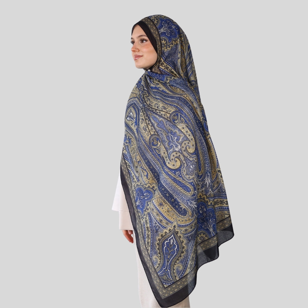 Dieser Hijab besteht aus weichem, atmungsaktivem Stoff und bietet ein angenehmes Tragegefühl. Er ist blickdicht, leicht formbar und für verschiedene Anlässe geeignet. Das Tuch zeichnet sich durch ein hochwertiges orientalisches Muster aus, das dem Design eine edle Note verleiht.