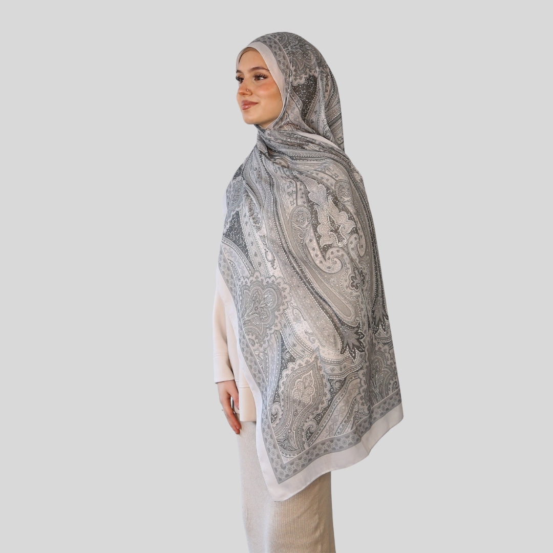 Dieser Hijab besteht aus weichem, atmungsaktivem Stoff und bietet ein angenehmes Tragegefühl. Er ist blickdicht, leicht formbar und für verschiedene Anlässe geeignet. Das Tuch zeichnet sich durch ein hochwertiges orientalisches Muster aus, das dem Design eine edle Note verleiht.