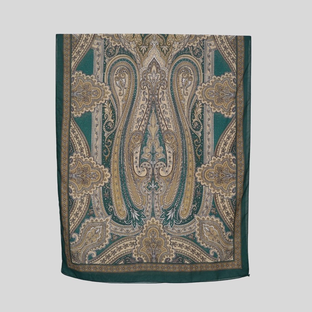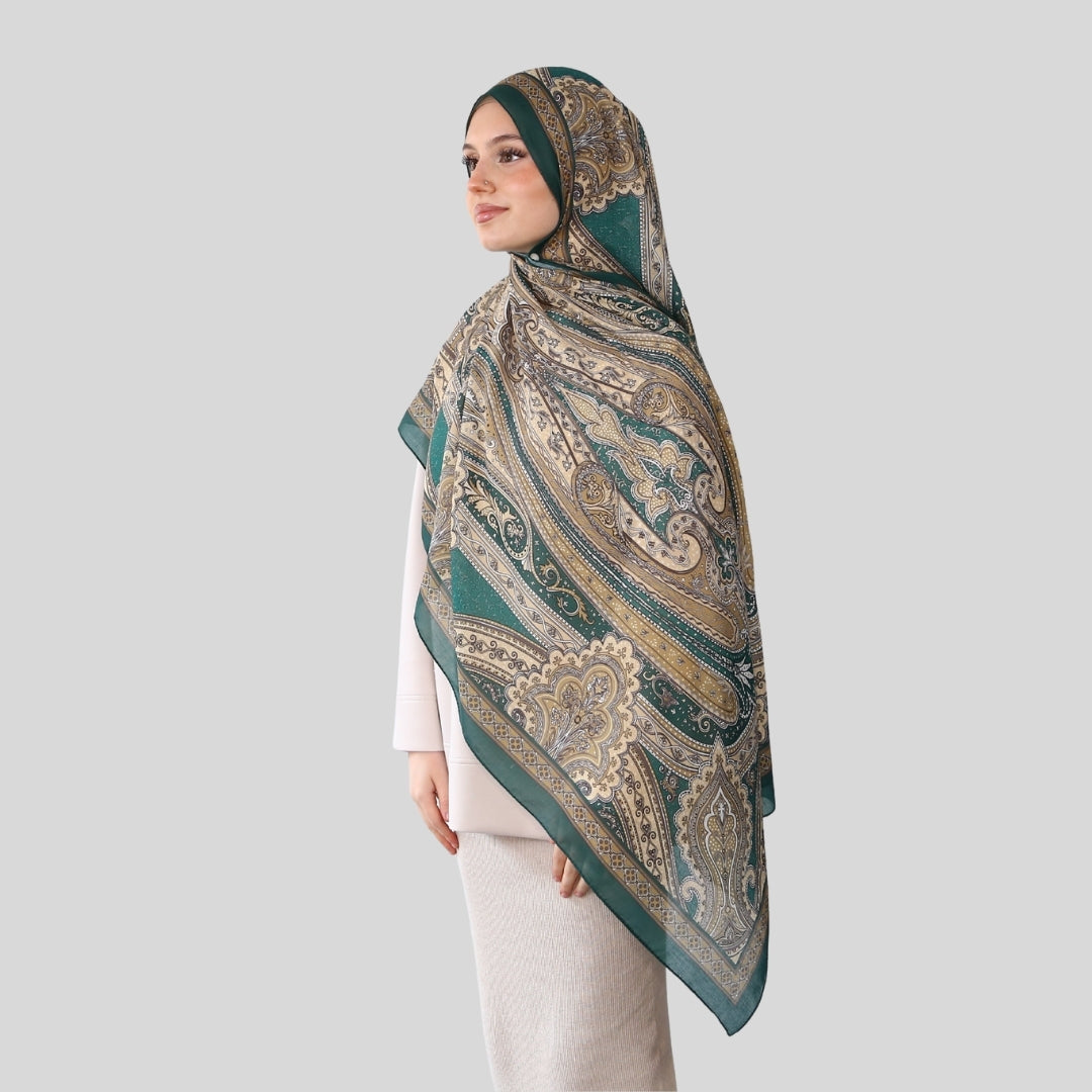 Dieser Hijab besteht aus weichem, atmungsaktivem Stoff und bietet ein angenehmes Tragegefühl. Er ist blickdicht, leicht formbar und für verschiedene Anlässe geeignet. Das Tuch zeichnet sich durch ein hochwertiges orientalisches Muster aus, das dem Design eine edle Note verleiht.